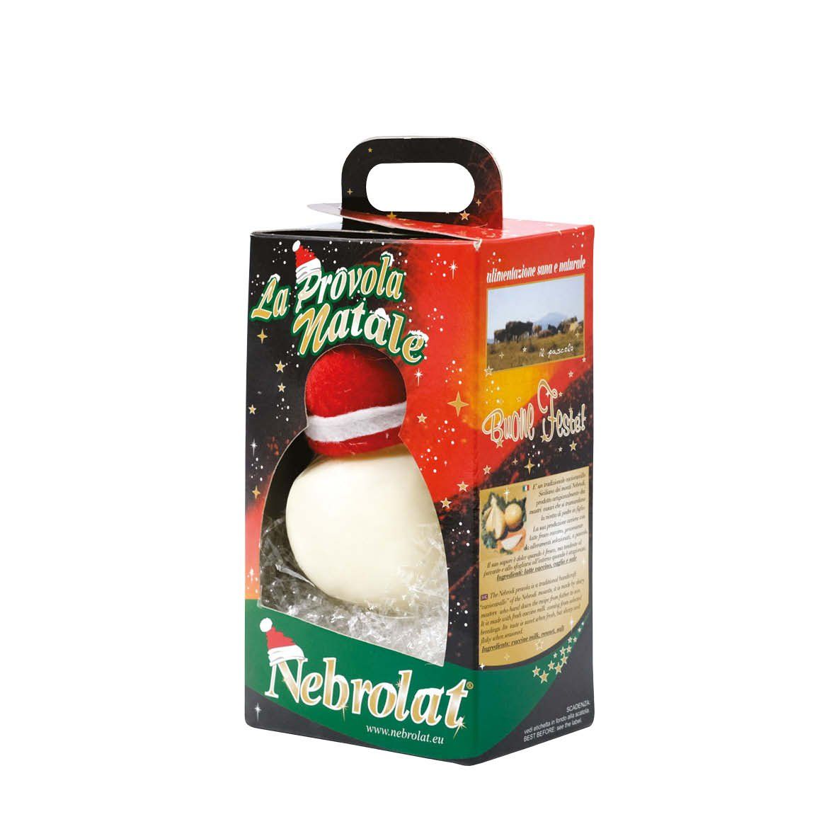 Inside this box, the provola has the classic shape and its peculiarity is that it has a small Christmas hat on top. It has a pleasant taste tending to spicy due to the typical maturation.
