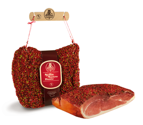 Inside this nice and unique box there are two slices of pecorino primo sale, one with black pepper and one with red pepper.